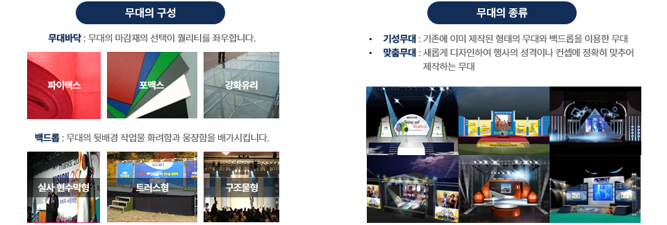 편의성(무대특색, 이동동선, 관람의 편의), 안정성(안전사고 예방을 위한 안전한 소재구성), 표현성(디자인 및 탁월한 시공을 통한 분위기 연출의 극대화)를 바탕으로 성공적인 행사를 이끌어 냅니다.