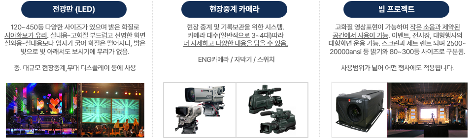 카메라와 같은 중계장비와 대형화면으로 구성되어 첨단 멀티 미디어 기술 및 시스템의 효율화를 극대화시켜 무대 식별을 최대화하고 관객의 행사집중을 원활히 하기 위한 시스템입니다.